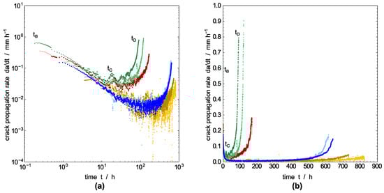 The crack propagation rate, which is calculated by a numerical derivative from the values in Figure 5 as described above, is plotted in Figure 6a,b in a double logarithmic and linear scale, respectively. It shows the acceleration of the crack growth before failure during . The double logarithmic plot in Figure 6a allows a clear separation between pre-crack growth and the actual crack growth stage . The two regions are indicated by a minimum between decreasing crack speed in the time interval and the accelerating crack velocity in the interval until the maximum crack length is achieved at time . The decrease of crack propagation rate in the time interval is apparently independent for all test liquids including water. As proposed by Duan and Williams [], this behavior is related to craze formation, and an implication of flow, and the orientation of polymer chains in amorphous regions in the process zone in front of and around the crack tip [,]. Alternatively, Stern et al. stated in [] that the decreasing crack speed in the beginning of the creep crack growth experiments under static load are possibly caused by a non-equilibratory size of the plastic zone introduced during the initiation time. However, the influence of pre-cracking is limited to the early state of testing [], which is in our experiments the time interval region . The crack propagation rate for the ESC under stationary conditions is established in the time interval .