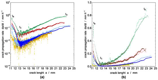 with . The rate of crack propagation is determined from the crack length data as a function of time by numerical differentiation. A simple secant procedure based on the calculation of the slope of the straight line between two data points (at a time interval of 25 data points) is applied [,]: .