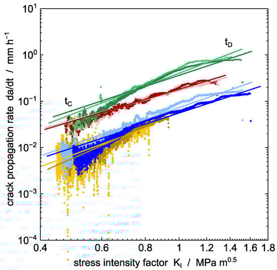 The mechanism of the SCG and ESC requires loads below the yield stress of the material. If, on the other hand, the stress intensity factor exceeds a critical value (the fracture toughness), instable crack propagation in brittle materials or plastic deformation (e.g., in the case of PE-HD) occurs, which leads to instable or ductile fracture, respectively. However, for stable crack propagation below the yield stress locally at the crack tip, the propagation rate is expected to be a power law function of the applied stress intensity factor [,,], referring to the Paris–Erdogan law [] for cyclic loading: