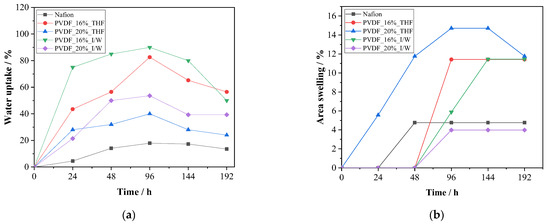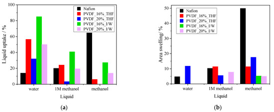 3.3.1. Liquid Uptake Capability and Area Swelling
