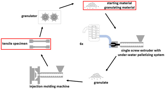 To analyze the effect of multiple processing steps on the properties of our materials, two closed-loop recycling cycles were simulated. The first cycle (further referred to as CL-E) used a 35 mm single-screw extruder (SML Maschinengesellschaft mbH, Lenzing, Austria) with a maximum mechanical power of 38.4 kW provided by the electrical drive unit and a maximum screw speed of 434 rpm. At the extruder head an EUP 50 under-water pelletizing system (Econ GmbH, Weisskirchen, Austria) was installed to granulate the extruded melt. To control the temperature of the extruder, it was equipped with six heating zones, as illustrated in Table 2, the feed opening (FO) and the heating zones one to three (Z1–Z3) are located directly on the barrel of the extruder, whereas adapter one (AD1) and adapter two (AD2) are responsible for heating the connections between the under-water pelletizing system and the extruder. The feed housing was water-cooled whereas the remaining barrel sections were cooled by forced air to avoid excessive heat generation. The materials were processed with a screw speed of 100 rpm which resulted in an output of approximately 25 kg/h. The melt temperatures for the PE- and PP-types were 200 °C and 230 °C, respectively. The bypass and the die plate were set at a temperature of 180 °C, the cooling water temperature was held beneath 30 °C. The granulation speed was around 1500 rpm, the dryer speed was around 800 rpm. The material was extruded and granulated six times and samples were taken before each extrusion step (marked with a red box in Figure 2).