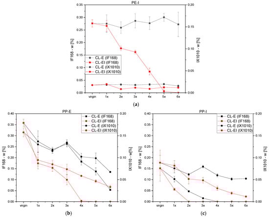 In Figure 4b,c, the stabilizer content in both PP grades after each loop is illustrated. PP-E possessed with approximately 0.35 w% for IF168 and 0.16 w% for IX1010 in the initial virgin state roughly double the stabilizer content than PP-I. The stabilizer contents of both materials showed a significant drop in both cycles. The remaining intact amounts of IF168 and IX1010 were in general lower after CL-EI than after CL-E. For both PPs, IF168 was sooner depleted than the IX1010, depicted in full IF168 loss for PP-E in the CL-EI after the fourth loop, for PP-I in the CL-E after the third loop, and for PP-I in the CL-EI after the first loop.