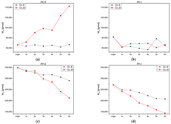 Figure S4 shows the MMD and Figure 5d the Mw of PP-I. Again, the typical degradation behavior of PP can be observed, and the molecular masses decreased continuously in both cycles, which led to an increase, a shift to lower values and a narrowing of the MMD. The Mw for the CL-EI was continuously lower than for the CL-E with the lowest value of 144,000 g/mol after six loops of CL-EI and of 210,000 g/mol after six loops of CL-E.