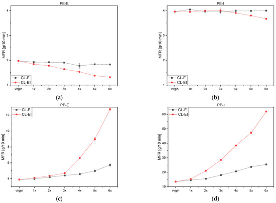 Both PP grades showed a significant MFR increase after both loops (see Figure 6c,d). PP commonly shows degradation in the form of chain scission as mentioned above. Due to shorter chains, the molecular mass decreased (see Figure 5) and the molecules were entangled to a lesser extent. This elicits better movement in the fluid state and the chains glide apart. Thus, in the same time a higher amount of material can flow through the measurement die, which resulted in an increased MFR. PP-E illustrated only a slight increase up until the third loop, where the MFR values started to increase in a non-linear way. PP-I shows a decrease of viscosity starting from the first loop.