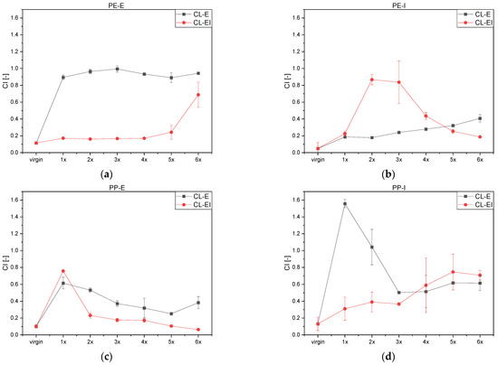 For PP-I, distinct CI values for the CL-E could not be distinguished due to the appearance of additional peaks which may have been present due to a lubricant used, such as estimated for PE-E before. For the CL-EI a continuous increase of the CI could be seen in Figure 7d.
