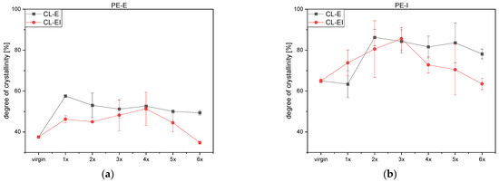 Figures S9 and S10 illustrate the melting peaks of both polyethylene grades with no significant trends. Additionally, the degrees of crystallinity are shown in Figure 8a,b. According to literature [13], typical crystallinity values for PE-LD range between 40 and 50%, whereas PE-HD lies between 60 and 80%, which is in agreement for the tested materials PE-E and PE-I, respectively. For both PE grades, the CL-EI values were lower than the values of the CL-E. Furthermore, the standard deviations of PE-I were bigger than the PE-E’s. Jin et al. [22] and Oblak. et al. [21] discovered rather constant degrees of crystallinities up until the 40th loop and 20th loop, respectively. This is in agreement with our measurements concerning PE, where no significant trend was obtained.