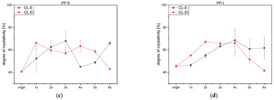 PP-I in Figure 8d on the contrary shows similar behavior to PE-I: For both cycles, the crystallinity increases and peaks at the fourth loop. However, with further processing the degree of crystallinity decreased again and was at its lowest at the last step. The CL-EI shows a steeper incline and a faster decline than the CL-E.