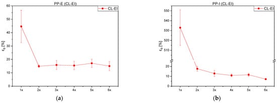 Strain at break values over the course of the processing loops of (a) PP-E, and (b) PP-I.