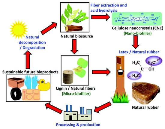 The incorporation of natural fiber in a rubber matrix promising a closed-loop sustainable approach for developing renewable and sustainable rubber. Reproduced with permission from []. Copyright 2021 The Royal Society of Chemistry.