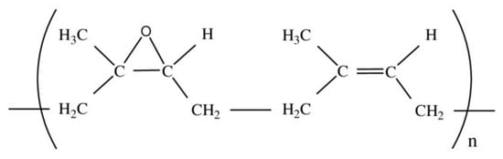 Natural rubber (NR) is derived from the latex of a rubber tree (Hevea Brasileansis), which consists of more than 98% polyisoprene []. Epoxidized Natural Rubber (ENR) is natural rubber (NR) to which epoxide units have been added to the double bond chain, as shown in Figure 5 []. This process is better known as an oxidation process that involves a simple reaction and usually uses inexpensive reagents [], such as acetic peroxide, which are formed in situ with formic acid and hydrogen peroxide []. ENR has better properties than NR in terms of oil resistance, wet grip, high absorption properties, and gas permeability []. In industry, there are three grades of ENR used based on the degree of epoxidation on its chain structure, namely ENR-10 (10% mole epoxy), ENR-25 (25% mole epoxy), and ENR-50 (50% mole epoxy). Table 3 shows the properties of the three ENR grades [].