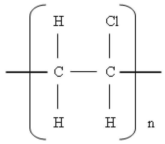 Poly(vinyl chloride) (PVC) is a type of thermoplastic polymer formed from a straight and long bonding chain and composed of vinyl chloride monomers, as shown in Figure 6. PVC is a form of polymer that has a wide range of applications in the engineering, medical device, packaging, and construction industries, among others [,].
