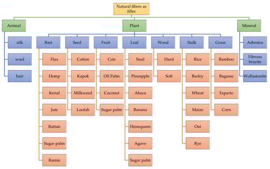 To date, global industries have thought about using natural fibers as an alternative to synthetic materials as one of the components in composites due to renewable nature and good marketing appeal in composite manufacturing industries [,]. The exceptional characteristics of natural fibers, such as low cost, low density, recyclability, biodegradability, and resource and abundance sustainability, make them the preferred material []. Natural fibers that come from either animals or plants can be used as fillers in polymer composites [,,]. Fillers are fine solids added to synthetic resins, rubber, or paints to improve their mechanical properties without altering the molecular structure of the polymer. Figure 8 shows natural fibers that are used to strengthen the matrix to improve and enhance the physical, thermal and mechanical properties of materials as well as reduce costs [,,,,,,,,,,]. According to Bicy et al. [], nanofiller shape and localization have a substantial impact on the membrane’s properties and porosity [,,].