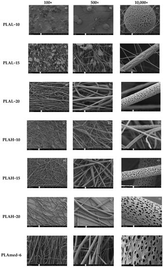 The morphology of pure PLAL, PLAH, and PLAmed fibers, which was fabricated by using various concentrations; (a–c) PLAL−10; (d–f) PLAL−15; (g–i) PLAL−20; (j–l) PLAH−10; (m–o) PLAH−15; (p–r) PLAH−20; and (s–u) PLAmed−6 at different magnifications (100×, 500×, and 10,000×).