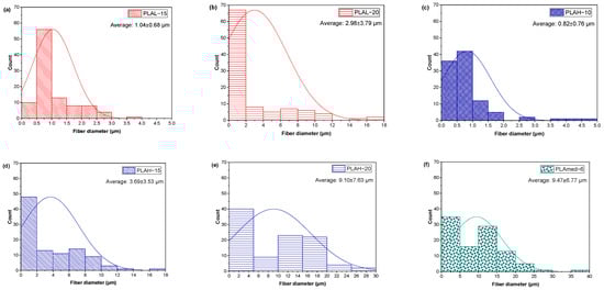 Histograms of electrospun fibers (a) PLAL−15; (b) PLAL−20; (c) PLAH−10; (d) PLAH−15; (e) PLAH−20; and (f) PLAmed−6.