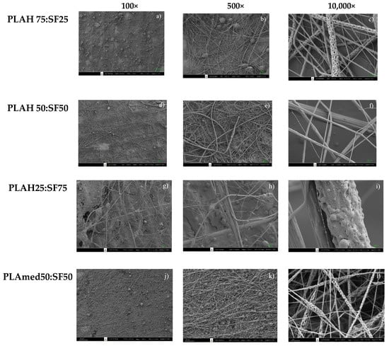 The morphology of (a–c) PLAH75:SF25; (d–f) PLAH50:SF50; (g–i) PLAH50:SF50; and (j–l) PLAmed50:SF50 fibers at different magnifications (100×, 500×, and 10,000×).