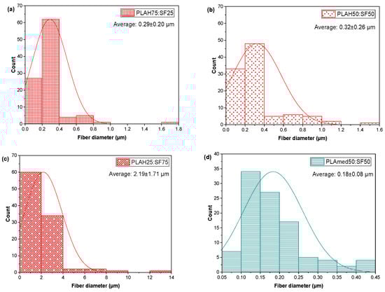 Histograms of electrospun fibers (a) PLAH75:SF25, (b)PLAH50:SF50; (c) PLAH25:SF75 and (d) PLAmed50:SF50.