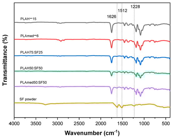 FTIR spectra of SF powder, PLAH −15, PLAH75:SF25, PLAH50:SF50, PLAmed−6, and PLAmed50:SF50 fibers.