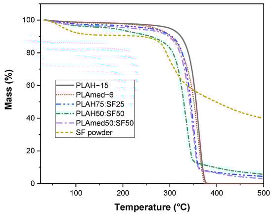 TGA thermograms of SF, PLAH−15, PLAH75:SF25, PLA50:SF50, PLAmed−6, and PLAmed50:SF50.