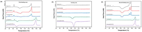 in which is the measured melting enthalpy (J/g) from the heating scan, is the theoretical melting enthalpy of completely crystalline PLA (93.7 J/g) [,], and WPLA is the PLA weight fraction in the biocomposites.