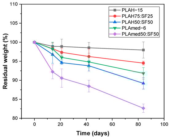 The effect of SF content on PLA/SF scaffold degradation was shown in Figure 8. Degradation profiles were shown as a percentage of residual weight of scaffolds by time. During the study period, both pure PLA and PLA/SF scaffolds degraded slowly. PLAH, PLAH75:SF25, and PLAmed exhibited very low degradation, while the weight of PLAH50:SF50 and PLAmed50:SF50 scaffolds decreased by time