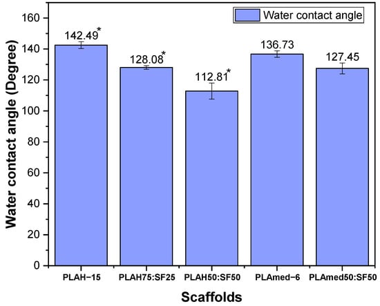 Water contact angle of PLAH−15, PLAH75:SF25, PLAH50:SF50, PLAmed−6, and PLAmed50:SF50 scaffolds; * From previous study [].