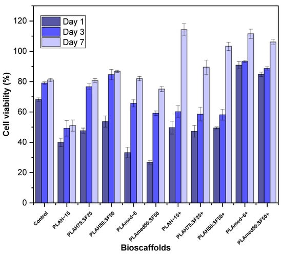 MTT assay was carried out to evaluate HCPCs viability on PLA and PLA/SF electrospun scaffolds. Rather than the PLA/SF ratio and PLA grading, the effect of ethanol treatment (+) on cell viability is shown in Figure 10. Generally, the HCPC viability of ethanol treated scaffold groups (+) was higher than that of the non-treated groups. The cell viability in untreated scaffold groups was lower than the control group at every time point except PLA50:SF50, which presented higher viability compared to the control group at days 3 and 7. In the alcohol treated group (+), PLAH+ scaffolds had lower cell viability compared to medical grade PLA scaffolds. Cell viability at days 1 and 3 were slightly different among PLAH+ groups and, at day 7, PLAH−15+ had higher cell viability than PLAH50:SF50+ and PLAH75:SF25+, respectively. PLAmed−6+ had slightly higher cell viability than PLAmed50:SF50+ at every time point.
