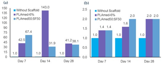 The gene expression analyses of HCPC seeded scaffolds were examined to demonstrate cellular phenotype. All groups of scaffolds were repeated with triplicate sample sets. The results were shown in Figure 11, and the expressions of COL1A1 of PLAmed−6 and PLAmed50:SF50 were higher than the cell without a scaffold at every time point. The expression of COL1A1 of PLAmed−6 was obviously higher than PLAmed50:SF50 (143.0 and 31.9) at day 7 and slightly higher at day 28 (41.2 and 38.1). On the other hand, PLAmed−6 and PLAmed50:SF50 had equivalent COL2A1 expression, which was higher than the control group at days 7 (1.4, 1.4) and 28 (2.0, 2.0). The highest expression of COL2A1 was observed at day 14 (2.0).