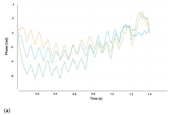 Illustrative example displaying ELS experiment results obtained for three consecutive measurements (blue, green, and orange curves) of the same sample. (a) Plot for the fast field reversal phase vs. time. (b) Plot for the frequency shift vs. time. Additional experimental data typically obtained from these plots are the quality factor of 1.37 ± 0.321, the zeta potential (mV) of −13 ± 0.506, the conductivity (mS cm−1) of 12.4 ± 1.69, and the mobility (μm·cm/V·s) of −1.02 ± 0.0395.