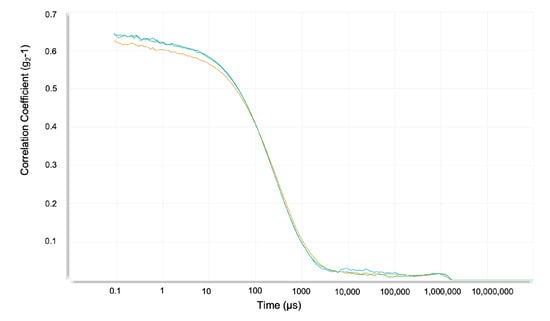 Illustrative example displaying three curves (blue, green, and orange) obtained from DLS experiments, each of them representing the correlation function (− 1) vs. t) of an independent measurement of the same sample. Additional experimental data typically measured from the correlation function are the z-average size of 190 nm ± 8.3 nm, a PDI of 0.56, derived mean count rate 366 ± 15.7 kpcs, and a diffusion coefficient of s.