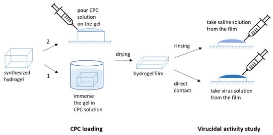 - Direct contact of the virus with the surface of CPC-containing gels: 150 µL of support medium containing the known amount of the virus was applied onto the surface of the gel for 5 s, after which the flowing liquid was collected and the titer of the virus, determined as described above (in order to establish changes in the titer caused by the contact with the surface of the CPC-containing gel).