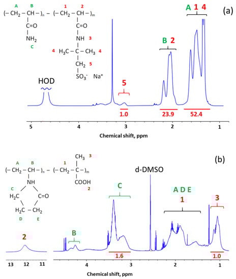 1H NMR spectra of synthesized copolymer gels: (a) PAAm-AMPSA in D2O, (b) PVP-MA in d-DMSO. Peak assignments were made according to Refs. [,,]. At the top, the peaks are labeled by letters (A, B, C, etc.) and numbers (1, 2, 3, etc.) corresponding to different protons in the polymers’ chemical structure drawn in the Figure. At the bottom, peak integrals used for quantification of the polymers’ composition are written under horizontal red lines.