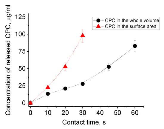 It is important for various practical applications to explore the release of disinfectant into small droplets of aqueous solution appearing on the surface, e.g., as a result of coughing/sneezing or touching by wet hands; therefore, to estimate the amount of CPC released, the gel samples were rinsed by a very small volume (0.2 mL) of 0.9 wt% aqueous NaCl solution. The amount of disinfectant passed into the solution at different contact times was determined by UV-spectroscopy using the absorption band of the pyridine ring of CPC at 259 nm.