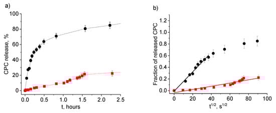 Let us first examine the effect of the initial degree of swelling of the gel on the release of the disinfectant. The data for initially water-swollen and dried PAAm-AMPSA hydrogels are shown in Figure 4 and Figure 5, respectively. The kinetic curves of CPC release from the water-swollen hydrogel (Figure 4b) demonstrate a t1/2 time dependence of the fraction of the released surfactant that is characteristic of Fickian diffusion [,]. The approximation is valid up to approximately 60% of the released solute, which is in accordance with previously reported data for polymer systems with Fickian release behavior []. In Fickian behavior, the relaxation processes of the polymer are very slow in comparison to the diffusion rate of the solute inside the hydrogel []. Figure 5b demonstrates that CPC release from the initially dried PAAm-AMPSA hydrogel also obeys Fickian law at the early stage (up to approximately 50% of the released solute).