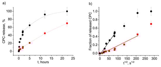 Release of CPC into physiological saline from water-swollen PAAm-AMPSA hydrogels containing 2 wt% AMPSA (PAAm-AMPSA-3v; degree of swelling, 16.0) (black circles) and 10 wt% AMPSA (PAAm-AMPSA-4v; degree of swelling, 17.1) (red squares) as a function of time t (a) and t1/2 (b). In both samples, the CPC/AMPSA molar ratio is 0.5, and the degree of cross-linking is 1:1000.
