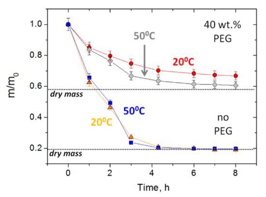 Loss of mass upon drying of PAAm-MA (10 mol%) gels containing no PEG (triangles—drying at 20 °C, squares—50 °C) or 40 wt% PEG400 (circles—drying at 20 °C, diamonds—50 °C). The initial gel samples in the form of disks with 0.5 mm thickness and 10 mm diameter were deposited on a glass substrate during drying.
