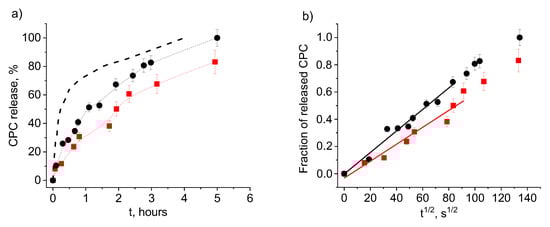 Release of CPC into physiological saline from water-swollen PAAm hydrogels with 2 wt% anionic units of different types: AMPSA (PAAm-AMPSA-6v, Table 1; degree of swelling, 5.1) (black circles) and MA (PAAm-MA, Table 1; degree of swelling, 5.0) (red squares) as a function of time t (a) and t1/2 (b). In both samples, the CPC/charged units molar ratio is 0.5; the degree of cross-linking is 1:500. The black dashed line describes CPC release from water-swollen PAAm-AMPSA hydrogel with 2 wt% AMPSA (PAAm-AMPSA-3v, Table 1; degree of swelling, 16.0), having a lower degree of cross-linking (1:1000).