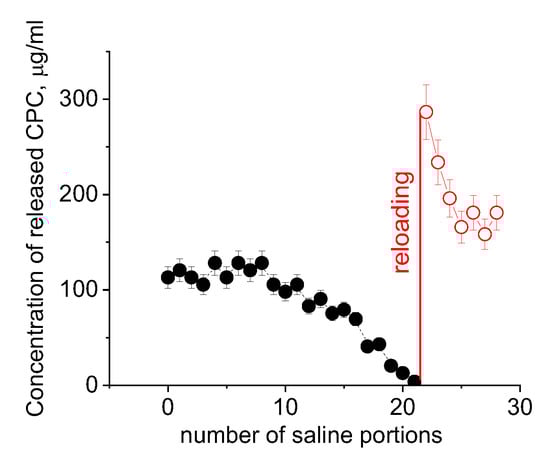 The polyelectrolyte gel/disinfectant complexes belong to released-based [] antiseptic materials. The lifetime of their antiseptic activity is limited by the amount of disinfectant embedded in the polymer matrix, which will exhaust over time. One can estimate that the complexes under study will keep their activity during ca. 103 treatments with 0.2 mL of saline solution. Further, the polymer matrix can be refilled with the disinfectant and reused. This is illustrated in Figure 8. Since it is very time consuming to make 1000 separate treatments with 0.2 mL water aliquots to remove most of the CPC, we first removed 98% of CPC by immersing hydrogel in 200 mL of physiological saline solution, dried the hydrogel and then studied the release of the remaining disinfectant by adding many times 0.2 mL portions of saline. The kinetics of the release of disinfectant to these final volumes of salt solution is illustrated in Figure 8. When the CPC was completely removed, the polymer matrix was reloaded with the disinfectant. Figure 8 shows that the reloaded gel effectively releases the disinfectant. In this case, the first portions of released CPC contain a large amount of disinfectant, probably, because, upon reloading, some CPC molecules did not penetrate deep into the polymer matrix. To avoid this, the dried hydrogel could be treated preliminarily with water to induce gel swelling and only then treated with a CPC solution.