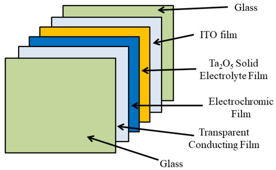 Ta2O5 metal oxide films are known in the area of semiconductors for their application as dielectric layers, which includes storage capacitors in dynamic random access memories (DRAM), gate oxides in field effect transistors (FET) and anti-reflective layers for silicon solar cells [47,48,49]. Recently, this material has been studied as a proton-conducting solid electrolyte in ECDs to replace the traditional liquid electrolytes [50], as shown in Figure 4. This is attributable to its high transparency and its ability as an ion storage layer.