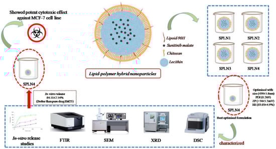 Sunitininb malate (SM) was purchased from “Mesochem Technology” Beijing, China. Chitosan and polyvinyl alcohol (PVA) were procured from Sigma Aldrich, St. Louis, MO, USA. Lipoid 90H was a generous gift from Lyon, France. Human breast cancer cell line (MCF-7 cells) with estrogen, progesterone, and glucocorticoid receptors was procured from the American Type Culture Collection (ATCC). All other chemicals used were of analytical grade, and Milli-Q water was used wherever needed.