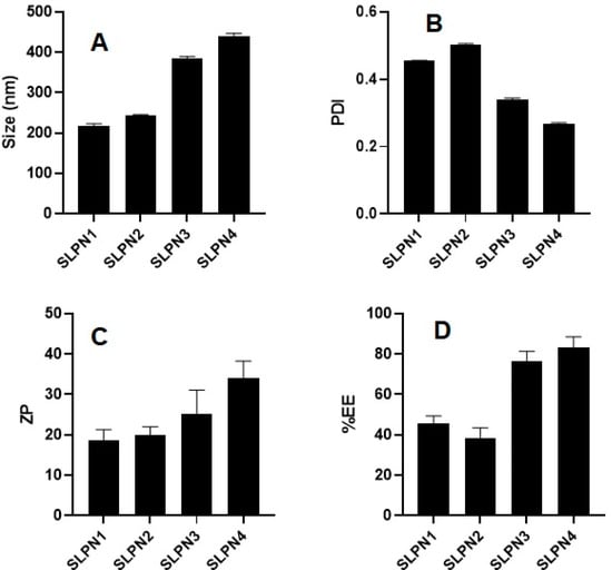 SM-loaded LPHNPs (SLPN1-SLPN4) were prepared by the single emulsification method. The developed LPHNPs were characterized for their particle size, PDI, and ZP and measured in the range of 218–439 nm, 0.269–0.504, and +18 to +34 mV, respectively (Figure 2). According to studies, nanoparticles with a size range of 40 to 400 nm are appropriate for ensuring long circulation duration and increased accumulation of drug in tumors with limited renal clearance [38,39]. The positive values of ZP was measured due to the amino group present on the surface of chitosan polymer [40,41]. From the results, it was observed that increase in concentration of chitosan in formulations increased the size of particles.