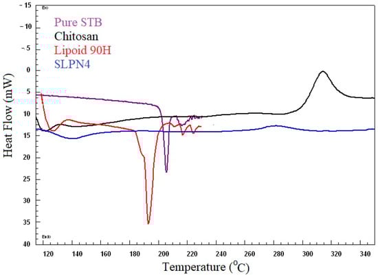 DSC spectra of pure SM, Lipoid 90H, chitosan, and optimized LPHNPs (SLPN4) are presented in Figure 3. DSC studies confirmed the crystallinity and amorphocity nature of the sample, which indicates the encapsulation of drugs in nanoparticles [20,43]. Pure drug SM exhibited a sharp endothermic peak at 205 °C, which indicates its melting temperature [44,45]. The SM peak completely disappeared in DSC spectra of SLPN4, confirming SM entrapment in LPHNPs. Sharp endothermic and broad exothermic peaks of lipoid 90H and chitosan could be seen near 193 °C and 320 °C, respectively.