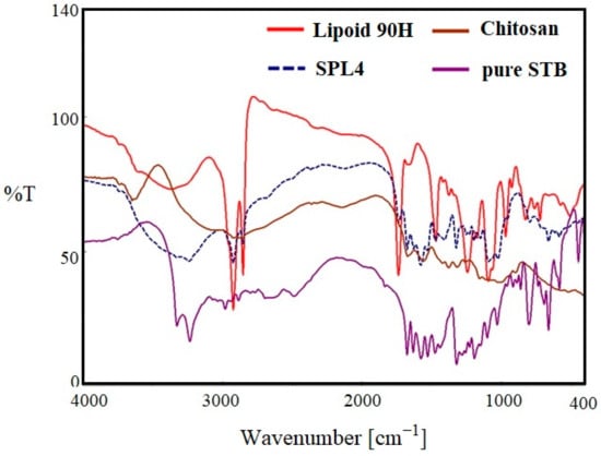 FTIR spectra of SM, lipoid 90H, chitosan, and optimized LPHNPs (SLNP4) were taken using the KBr technique. The samples were mixed with crystalline KBr and the mixture was then compressed into transparent pellets using a hand-held compression machine. Thin transparent sample film enclosed in the die was fixed into the sample holder and scanned in the range of 400–4000 cm−1 (Jasco, V750, FTIR spectrophotometer, Tokyo, Japan). Peaks at the fingerprint region were interpreted, and additional or absent peaks were then studied for possible functional group interactions between drug and excipients. Spectrums were then collaged and presented for compatibility study [33].