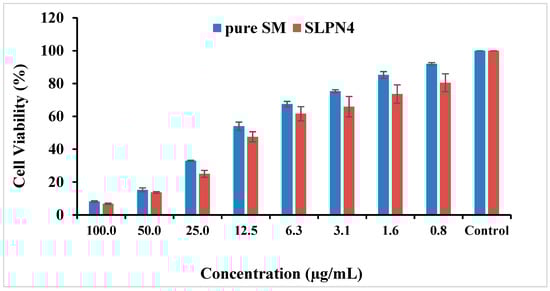 Cytotoxicity of pure SM and SLPN4 after 48 h incubation with MCF-7 cells at concentrations 0.8–100 µg/mL.