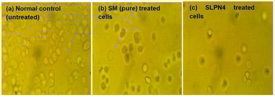The cytotoxic effect of pure STB and SLPN4 was also determined by visualizing the morphological changes in MCF7 cells [34]. The IC50 value of SM (10.79 µg/mL) equivalent to SLPN4 (8.24 µg/mL) was taken as the dose of treatment and morphological features were manifested by phase-contrast microscopy. Morphological features such as membrane blebbing, cell shrinkage, and necrosis were determined.