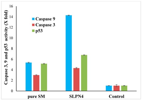 Apoptosis is a type of programmed cell death that involves the disassembly of intracellular components while avoiding injury and inflammation to nearby cells [52,53]. The activation of caspase-3, -9, and p53 are mainly responsible for cancer cell apoptosis [54,55]. In this study, an increase in caspase 3, 9, and p53 production in pure SM- and SLPN4-treated MCF-7 cells was compared to the untreated control group to confirm apoptosis. When MCF-7 cells were exposed to pure SM and SLPN4, their caspase 3, 9, and p53 activity was found four, fourteen, and seven times higher compared with control (untreated) cells, respectively (Figure 10). Enhanced effectiveness of SM in LPHNPs suggests a possible reason for induction of apoptosis in cancer cells.