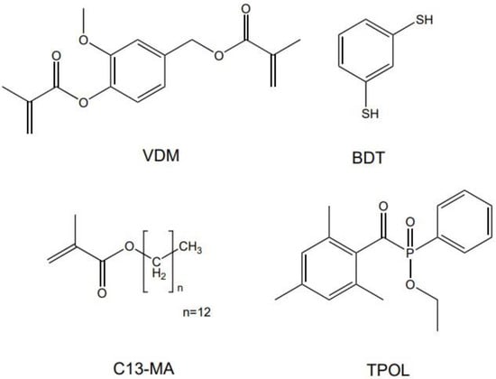 Vanillin dimethacrylate (VDM, Specific Polymers, Castries, France), 1,3-benzenedithiol (BDT, Fluorochem, Glossop, United Kingdom), tridecyl methacrylate (C13-MA, VISIOMER® Terra C13-MA, Evonik, Essen, Deutschland), ethyl(2,4,6 trimethylbenzoyl)phenylphosphinate (TPOL, Fluorochem, Glossop, United Kingdom), (Figure 1) were used as received.
