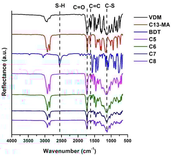The chemical structure of the photocross-linked polymers was confirmed by FT-IR spectroscopy. Signals of C=O, which were present at 1714–1735 cm−1, and those of the C=C group, which were present at 1606–1639 cm−1 in VDM and C13-MA spectra, were also reduced in polymer spectra. The signals of the S-H group, which were present at 2560 cm−1 in the BDT spectra, were not visible in the polymer spectra and the new signal of the C-S group was detected at 1120–1122 cm−1 in the polymer sample spectra. These changes in the polymer spectra indicated the formation of cross-linked structures in the polymers. As an example, the FT-IR spectra of VDM, C13-MA, BDT, and polymers C5–C8 are presented in Figure 3.