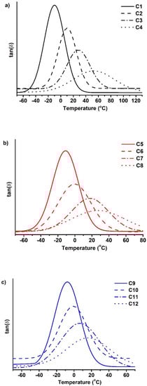 DMTA thermograms of cross-linked polymers C1–C4 (a), C5–C8 (b), and C9–C12 (c).