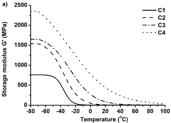 Dynamical mechanical thermal analysis (DMTA) was performed to characterize the mechanical properties of the developed polymers. The dependence of the storage modulus G′ on temperature was measured (Figure 6) and the values of G′ before and after the glass transition temperature were compared (Table 3). For the compatible results, the storage modulus values were taken from the plateau of the curve as the plateau indicates that polymer is in the steady state and that no changes in its structure are happening. The chosen temperatures were −80 °C (before Tg) and 100 °C (after Tg). After the results were compared, it was determined that the storage modulus of these polymers decreases greatly as the temperature increases to values higher than those of their Tg. Because of this, the developed polymers are rigid materials below their glass transition temperature and become soft and flexible when the temperature increases above their Tg. For example, the storage modulus of polymer C1 was reduced from 761.99 MPa to 3.36 MPa when the temperature increased from −80 °C to 100 °C. These results correlate to the rheological and thermal characteristics, as the same tendencies occur when these polymers are compared. For example, polymers C4, C8, and C12, prepared with different amounts of C13-MA, show that the storage modulus reduces from 2350.37 MPa to 661.37 MPa (at −80 °C) when the amount of C13-MA increases from 1.5 mol to 4.5 mol, which was the result of an increased amount of flexible tridecyl methacrylate chains, as mentioned above. Increased amounts of BDT in the polymer also reduced the rigidity of the polymers. For example, rigidity was reduced from 902.59 MPa (polymer C8 at −80 °C) to 386.44 MPa (polymer C5 at −80 °C) by increasing the amount of thiol from 0.25 mol to 1 mol, due to the formation of flexible thioether linkages, as also mentioned earlier.