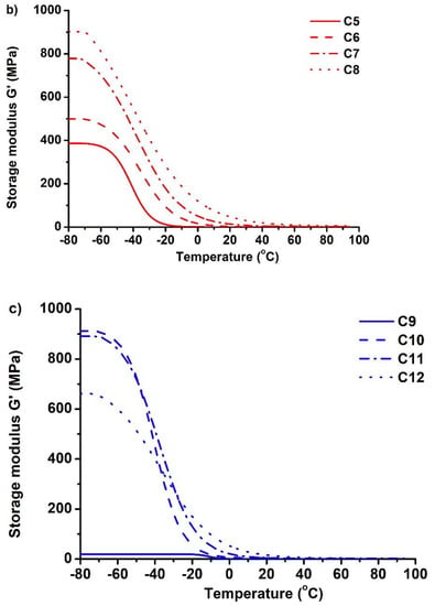 Dependency of the storage modulus G′ of polymers C1–C4 (a), C5–C8 (b), and C9–C12 (c) on temperature.